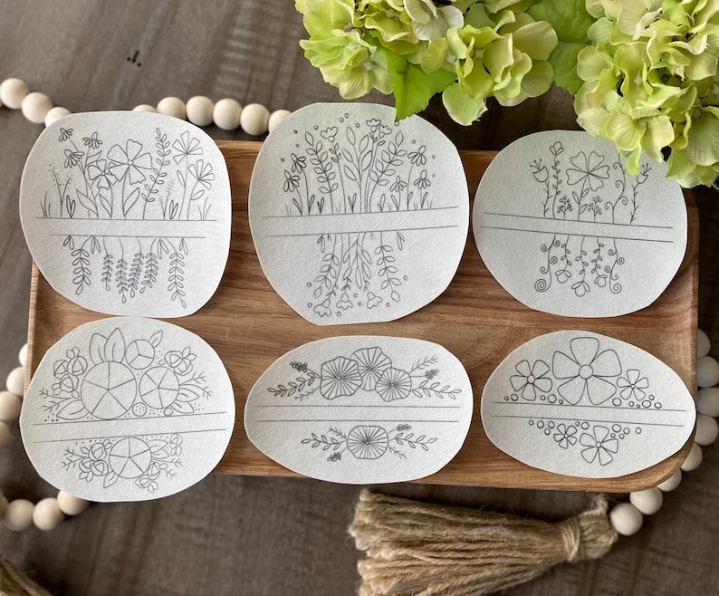 🧶The designs come pre-printed on washable adhesive backing paper. Simply peel off the backing, apply to fabric, and let your embroidery creativity run wild!