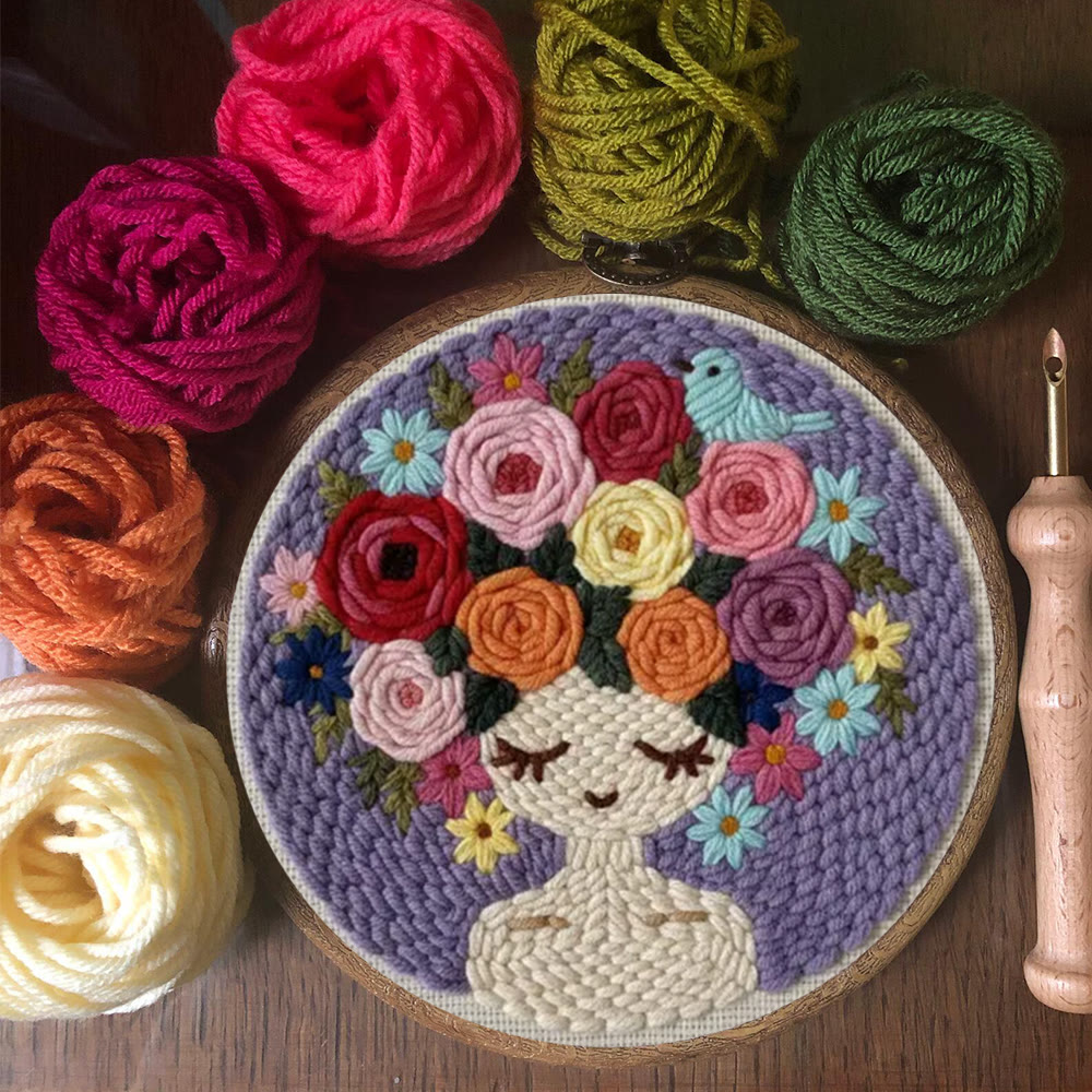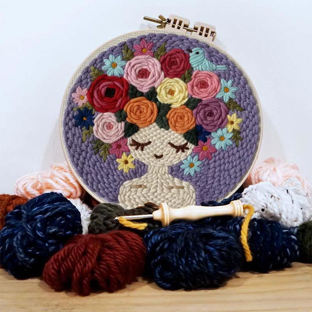 Pastel Floral Portrait With Bird Punch Needle Kit – Artistic Handcraft DIY Work | Elegant Home Decor
