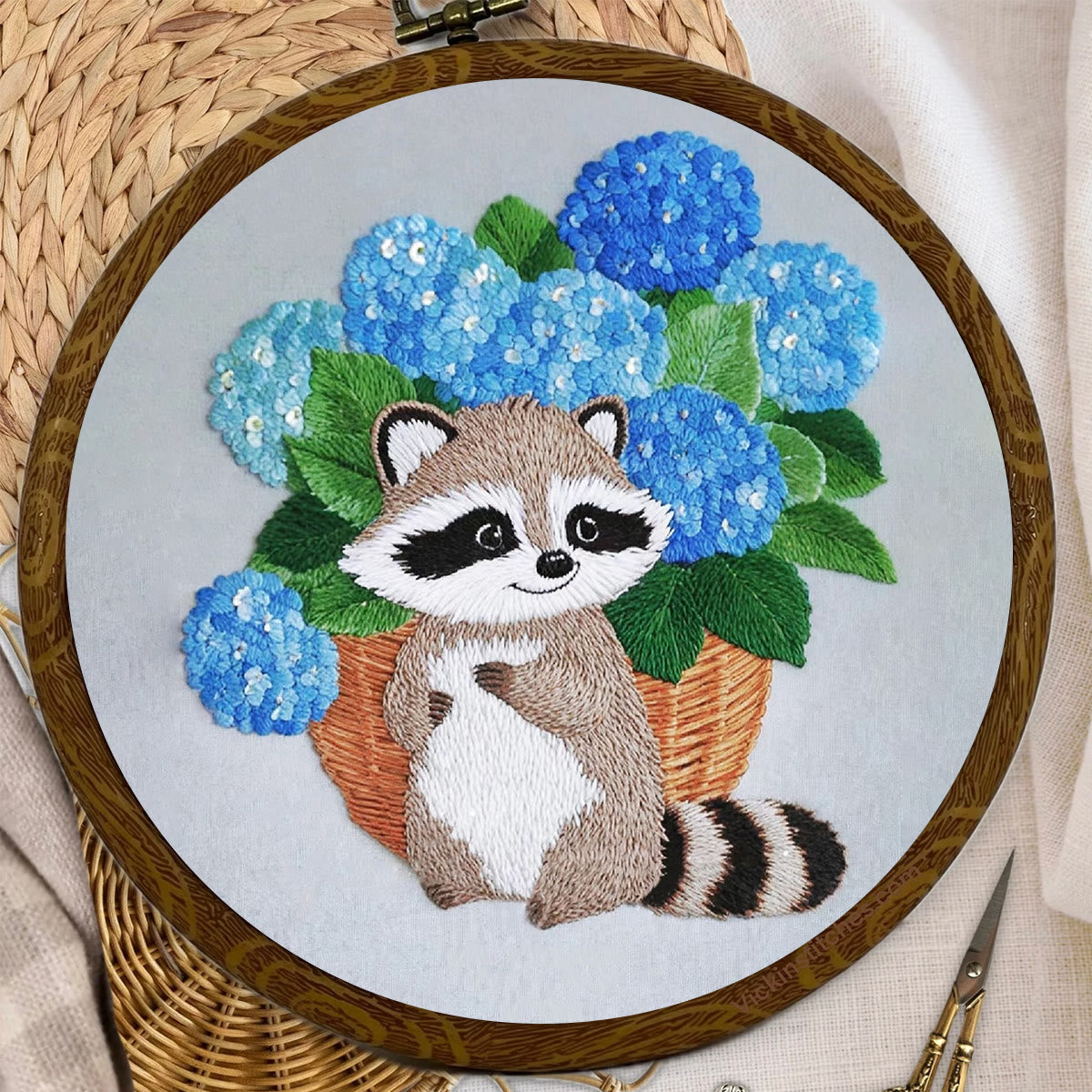 Rubbyoo Embroidery Kit- Cute Raccoon With Blue Flower 2 Diy Craft Kits | For Craft Lover