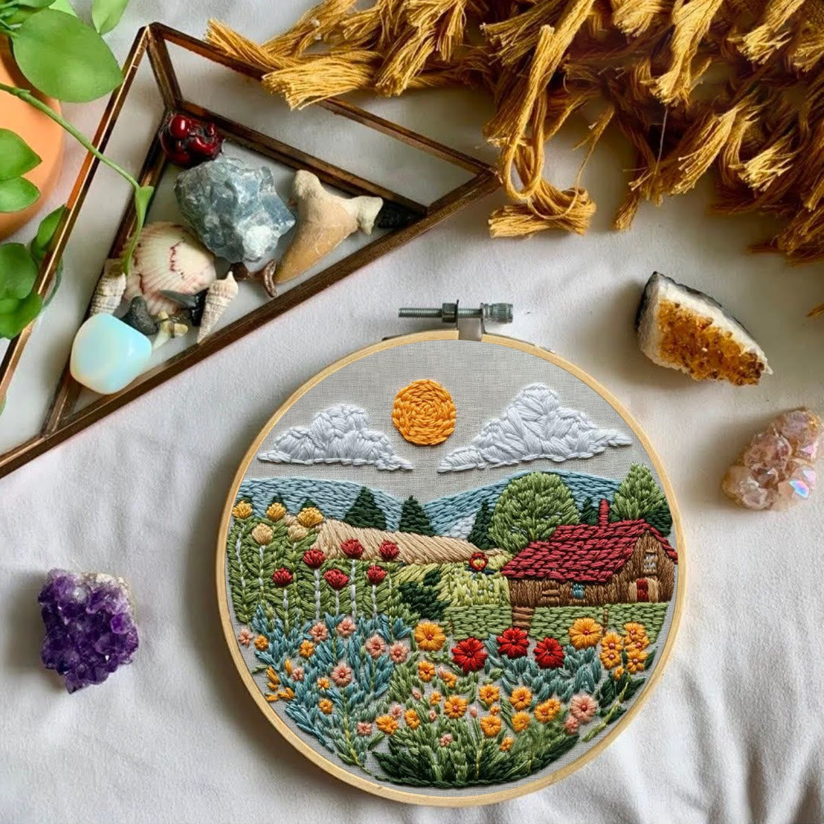 Rubbyoo Embroidery Kit - Sunlit Flower Field Cottage | Vibrant Indoor Wall Accent | Top Gifting Option